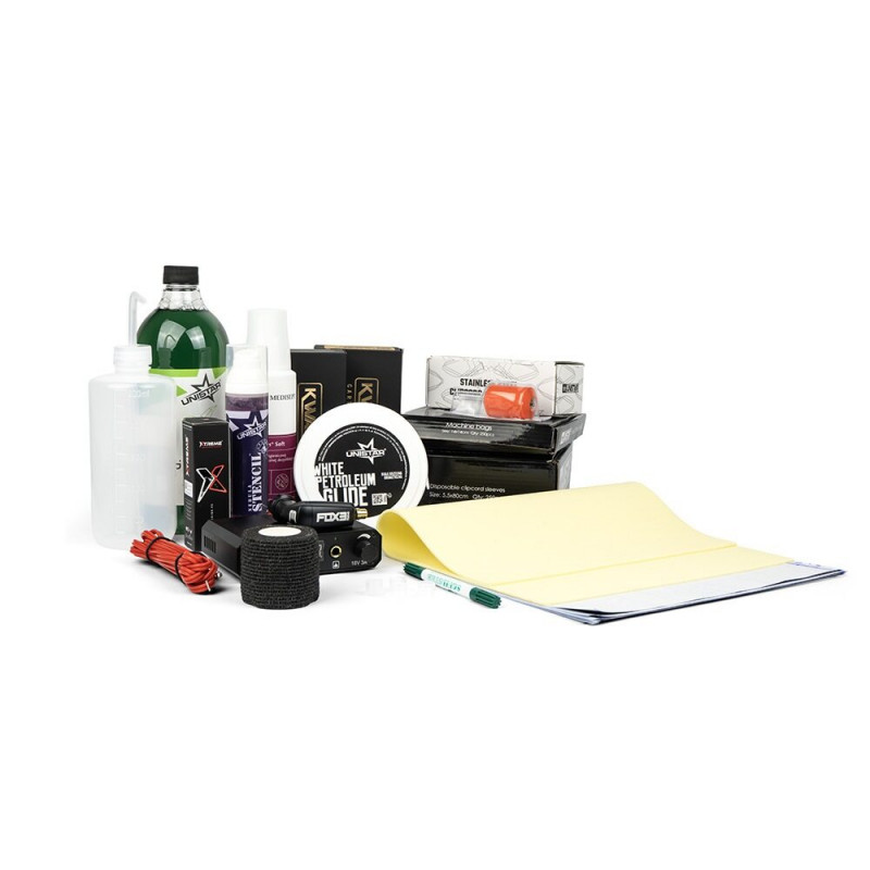 Kompletní sada pro začátečníky v tetování, která vám umožní učit se i procvičovat si své tetování. Řešení pro ty, kteří s tetováním tetují tetovacími potřebami – vybavení, kosmetika, příslušenství a široký výběr cartridge v jedné sadě. Buďte připraveni na procvičování a první sezení se startovací sadou, která obsahuje vše, co potřebujete.