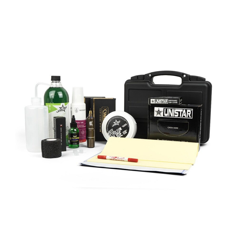 Startovací sada pro tetování, která vám umožní učit se a rozvíjet své dovednosti. Kompletní sada s tetovacím strojkem, mobilním napájecím zdrojem, tetovací kosmetikou, příslušenstvím a širokým výběrem Kwadron cartridges . Připravena k učení, cvičení a prvním sezením ve studiu nebo na cestách.
