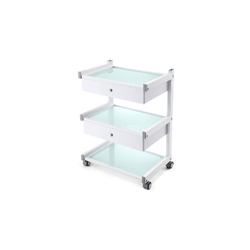 Kovovo-skleněný tetovací stolek - dvě prostorné zásuvky, tři skleněné police. Ideální pro uložení nářadí a příslušenství.