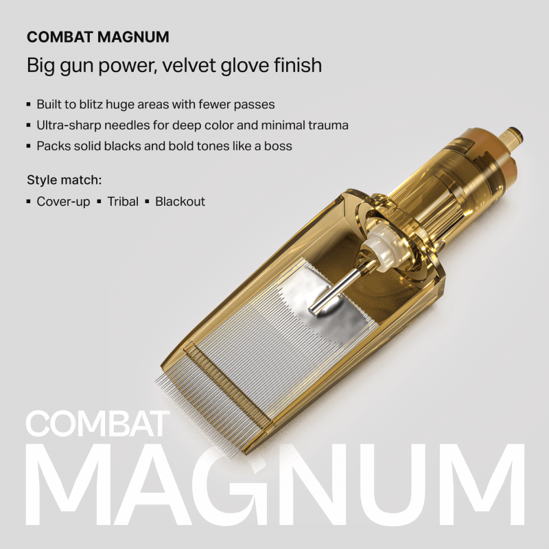 Combat Soft Edge Magnum 30/85 is the biggest and newest cartridge added to the Kwadron Cartridge System. Designed for flawless blackwork and smooth performance with any modern tattoo machine. It fills massive pieces with ink in a matter of seconds. Tattoo like a professional and change the world with your art - with Kwadron.