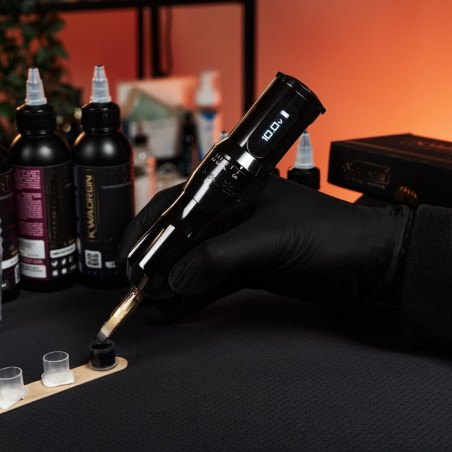Its versatility is further enhanced by the two batteries included in the set. The lighter, smaller battery is perfect for detailed work and shorter sessions — reducing hand fatigue and increasing control. The larger battery delivers long, stable power for big, demanding pieces. Thanks to this duo, the FK One Adjust adapts exactly to your workflow, no matter the technique, style, or session length. One machine. Total flexibility.