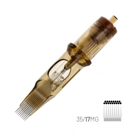 The highest quality Kwadron 0.35 mm (#12) MG or Magnum cartridge. Magnum cartridges are dedicated to shading and filling, ideal for large, wide areas. They perfectly pierce colour under the skin and traumatise it less. The needles in this type of cartridge are arranged in a double, offset row. Always use the largest magnum that is suitable for the design to make tattooing easier and to achieve consistent colour transitions.