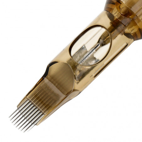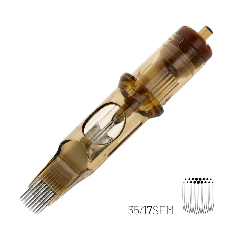 A top quality Kwadron SEM Soft Edge Magnum cartridge with a diameter of 0.35 mm (#12). The curvature of the needles in this cartridge creates what is known as a haze when shading, i.e. a more intense colour in the centre and a shadow cast on the outside. Ideal for creating tonal, smooth transitions, fading effects and the like. Great for filling in black or colour, softer shading (less traumatic to the skin), as in portraits, realism or blurred backgrounds.