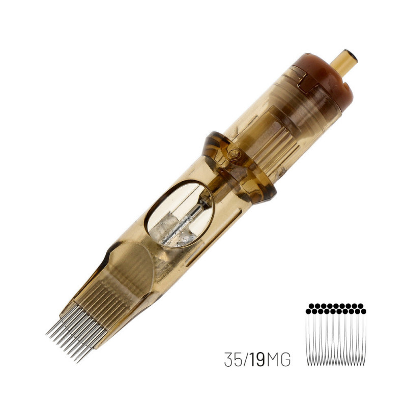 The highest quality Kwadron 0.35 mm (#12) MG or Magnum cartridge. Magnum cartridges are dedicated to shading and filling, ideal for large, wide areas. They perfectly pierce colour under the skin and traumatise it less. The needles in this type of cartridge are arranged in a double, offset row. Always use the largest magnum that is suitable for the design to make tattooing easier and to achieve consistent colour transitions.