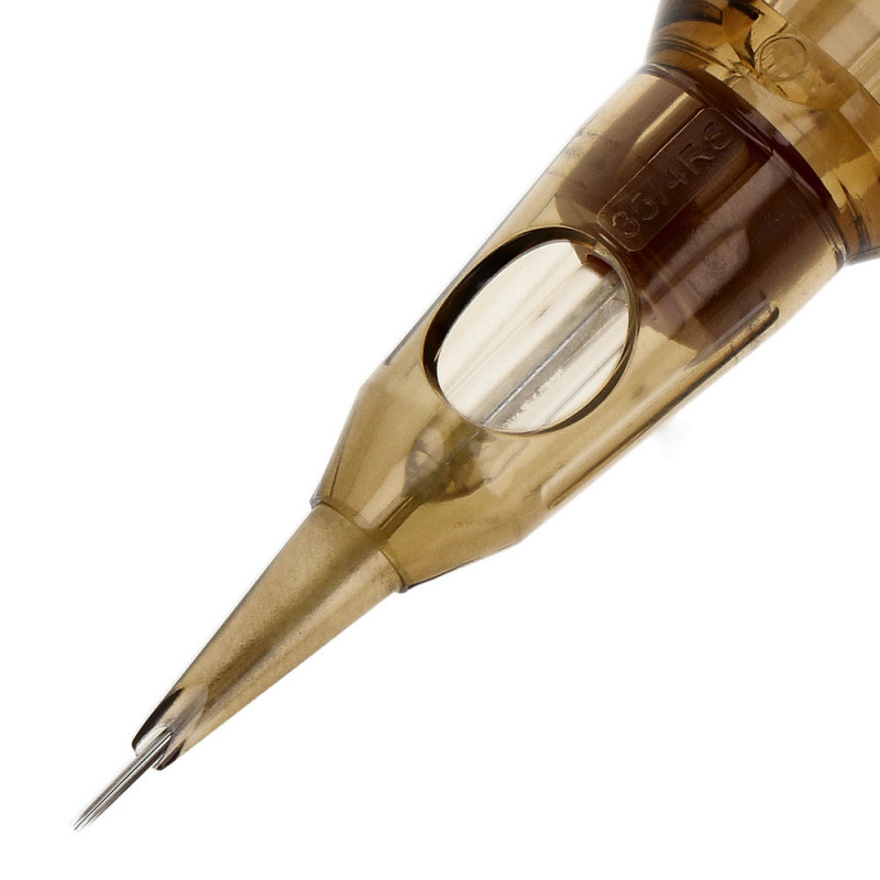 Medium Tapered needles are used to create bolder, wider, more old-school strokes allowing more needle to skin contact to drive more ink under the skin. Round Shader Cartridges are used to fill in colour and shade the tattoo after the contour has been made. The needles are arranged around the circumference of the circle, parallel to each other. This is the main difference between the Round Shader and the Round Liners, where the needles are also arranged along the circumference of the circle, but clustered into a point. With adequate spaces between the needles, they provide the perfect ink flow necessary for shading, creating tonal transitions.
