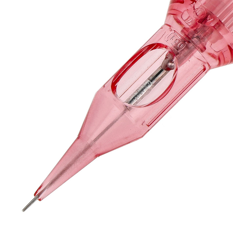 These are three 0.25mm needles with a Round Shader type and Point Tapered sharpening step (2.5mm sharpening length) and a textured surface needle, which allows the needle to penetrate more pigment. The cartridges are designed for creating contours and lines and fills. The PT taper needle is double-sharpened, meaning that in addition to the usual sharpening, the tip of the needle itself has been further sharpened at a different, more obtuse angle. This type of sharpening means that the PT needle is not as sharp as the LT, allowing it to be inserted more gently into the skin. PT - Point taper (2.5mm double sharpened).