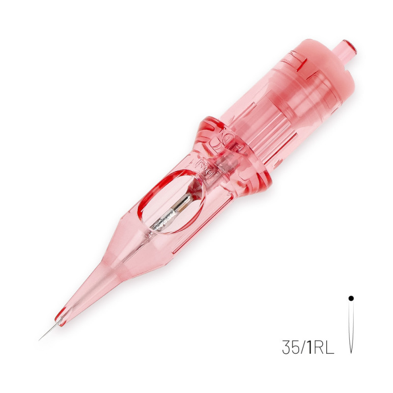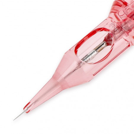 The housing is made of hard, medical-grade plastic that doesn't abrade during the needle's movement, preventing any plastic fragments from getting under the skin, eliminating the possibility of inflammation. A protective membrane prevents fluids from reaching the machine, further stabilizing the needle and increasing precision. Extra-sharp needles ensure excellent precision and prevent skin damage, resulting in better results during and after healing. The textured walls inside the tip allow the cartridge to perfectly absorb and deliver pigment, ensuring even application. The beak, individually designed for each needle size, allows for a perfect fit, resulting in stable, even, and precise work.