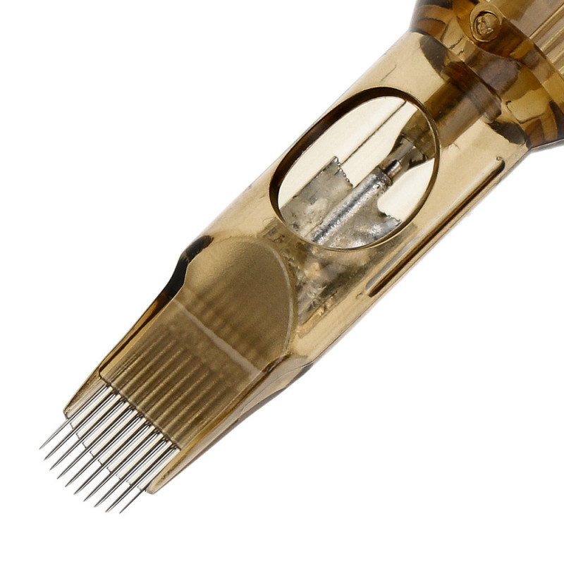 Non seulement les aiguilles marquées 0,35 (#12) sont plus grandes que celles marquées 0,30 (#10), mais les distances entre les aiguilles dans leur configuration sont également plus grandes. Par conséquent, alors qu’une aiguille 0,35/15 Magnum, par exemple, vous permettra de remplir rapidement une grande zone de tatouage avec de la couleur, une configuration 0,30/15 Magnum sera légèrement plus petite, même si elle comporte le même nombre d’aiguilles, car elles sont placées plus près l’une de l’autre. L’utilisation d’une aiguille cartouche de 0,30 (#10) permet une application plus douce de la couleur sur la peau, un ombrage plus doux et des transitions plus douces entre le noir et le gris. La plus petite taille de 0,25 (#08) permet d’obtenir des détails fins, par exemple dans les portraits, elle permet de passer plusieurs fois sur la peau, ce qui minimise les dommages causés à la peau mais ralentit le travail. Si vous devez indenter ou remplir une zone avec une couleur unie, choisissez 0.30 (#10) ou de préférence 0.35 (#12).
