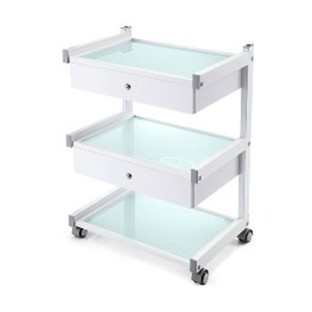Tavolo per tatuaggi in metallo-vetro: due ampi cassetti, tre ripiani in vetro. Ideale per riporre attrezzi e accessori.