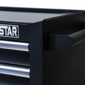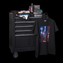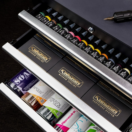 Stazione di lavoro mobile per riporre l'attrezzatura per tatuaggi. Dotato di cinque ampi cassetti, capaci di contenere tutti gli accessori necessari, e di un piano di lavoro con un pratico sovrapposizione in acciaio inox.