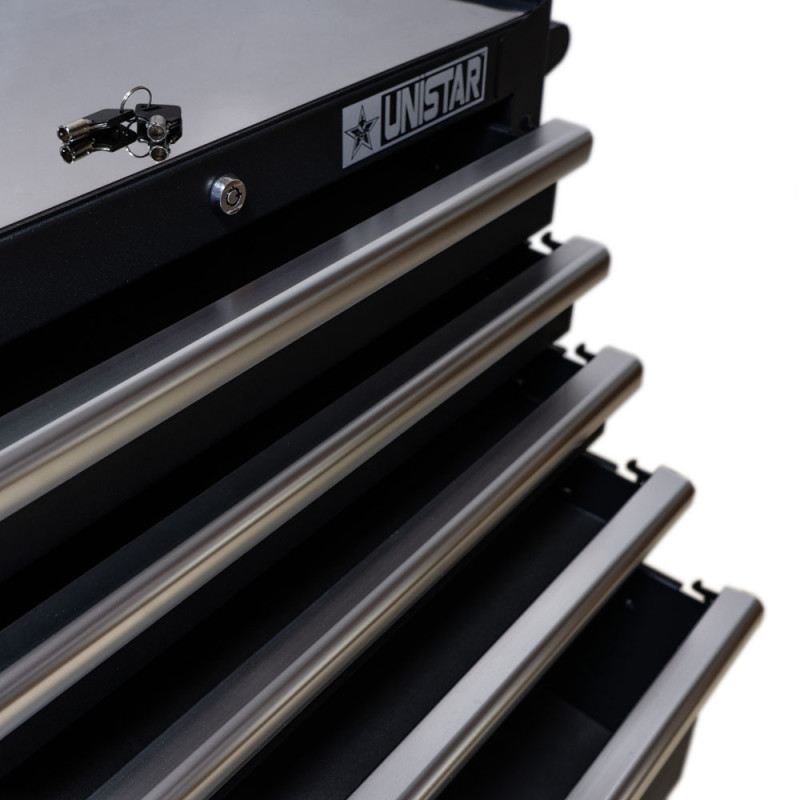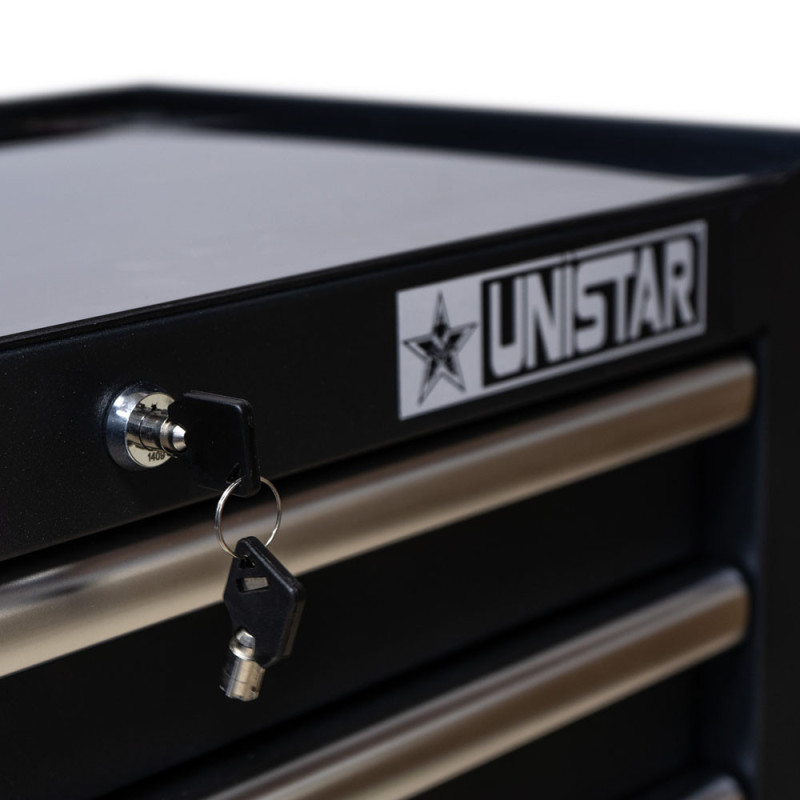 La postazione di lavoro è costruita su un robusto telaio in acciaio saldato. È dotata di quattro ruote gommate e di una comoda maniglia, che consentono di spostare facilmente la stazione in qualsiasi luogo. Le ruote sono dotate di uno speciale bloccaggio, trasformandolo in un armadio stabile. Inoltre, la possibilità di chiuderlo con una chiave garantisce la sicurezza del suo contenuto.