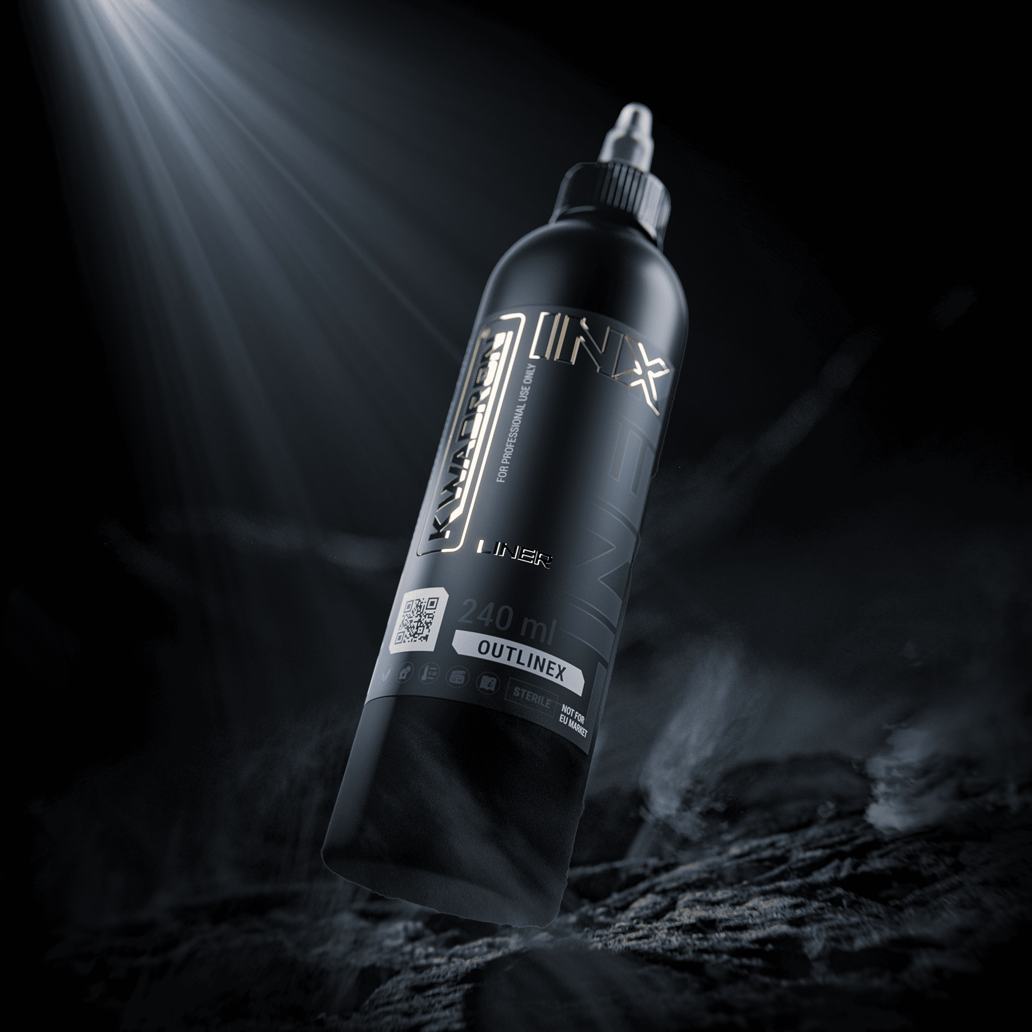 Kwadron INX Outlinex został stworzony w oparciu o innowacyjną technologię SONIC DIFFUSION PIGMENTS™. To właśnie ona odpowiada za wyjątkowo nasyconą i trwałą czerń, która od pierwszego dotyku ze skórą zachwyca swoją głębią. Dzięki niej każda linia jest jednolita i wyrazista, a tusz pracuje płynnie, umożliwiając precyzyjne i bezproblemowe tatuowanie – od pierwszego ruchu aż do ostatniego detalu.