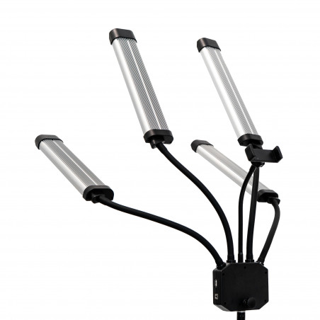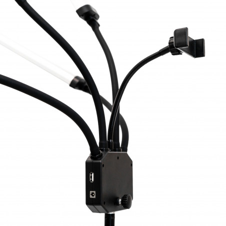 Lampa wyposażona jest w stabilny statyw oraz port USB do ładowania telefonu – idealna opcja na długie sesje w studiu.