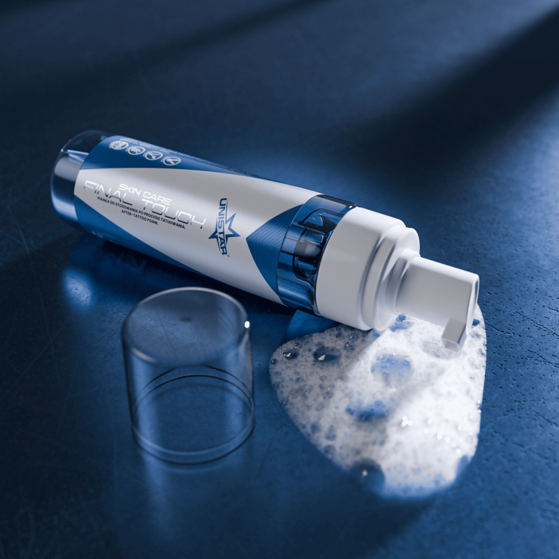 Unistar Skin Care Final Touch este o spumă concepută pentru etapa finală a procesului de tatuare. Scopul său este de a curăța pielea, de a calma iritațiile și de a susține regenerarea. Aluanul de potasiu conținut în spumă are un efect astringent, ajutând la reducerea iritației după procedură. Pantenolul calmează senzația de arsură și susține reînnoirea epidermei.